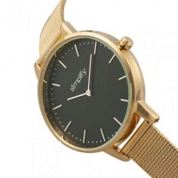 Gold-tone metal case with a gold-tone stainless steel mesh bracelet. Fixed gold-tone metal bezel. Black dial with silver-tone hands and index hour markers. Minute markers around the outer rim. Dial Type: Analog. Quartz movement. Scratch resistant mineral crystal. Pull / push crown. Solid case back. Round case shape. Case size: 38 mm. Case thickness: 9 mm. Band width: 14 mm. Box clasp. Water resistant at 30 meters / 100 feet. Functions: hour, minute. The 5800 Series. Casual watch style. Watch label: Japan Movt. Simplify The 5800 Black Dial Watch SIM5803.