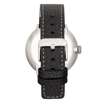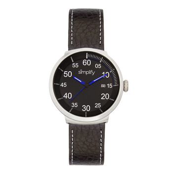Silver-tone alloy case with a black leather strap. Fixed silver-tone alloy bezel. Black dial with luminous blue hands and index hour markers. Arabic numeral minute markers (at 5 minute intervals). Dial Type: Analog. Luminescent hands. Date display at the 3 o'clock position. Quartz movement. Scratch resistant mineral crystal. Pull / push crown. Solid case back. Round case shape. Case size: 42 mm. Case thickness: 11 mm. Band width: 20 mm. Band length: 8.5 inches. Tang clasp. Water resistant at 30 meters / 100 feet. Functions: date, hour, minute, second. The 7100 Series. Casual watch style. Watch label: Japan Movt. Simplify The 7100 Quartz Black Dial Black Leather Watch SIM7103.