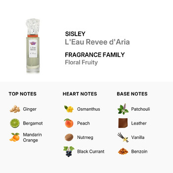Belonging to the Floral Fruity fragrance family, L’Eau Rêvée d’Aria opens with vibrant top notes of fresh ginger, sparkling bergamot, and juicy mandarin orange. This energetic burst leads into a heart of osmanthus, peach, nutmeg, and black currant—creating a soft, sweet, and slightly spicy bouquet that feels both comforting and bold.