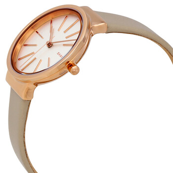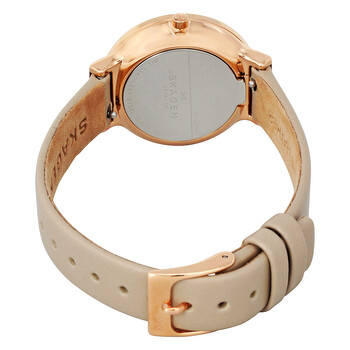 Rose gold-tone stainless steel case with a beige leather strap. Fixed rose gold-tone bezel. White dial with rose gold-tone hands and index hour markers. Dial Type: Analog. Quartz movement. Scratch resistant mineral crystal. Pull / push crown. Solid case back. Case size: 30 mm. Case thickness: 7 mm. Round case shape. Band width: 12 mm. Band length: 8 inches. Tang clasp. Water resistant at 50 meters / 165 feet. Functions: hour, minute, second. Additional Info: in general, suitable for short periods of recreational swimming, but not diving or snorkeling. Casual watch style. Skagen Ancher White Dial Ladies Watch SKW2481.