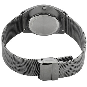 Charcoal stainless steel case with a charcoal stainless steel mesh bracelet. Fixed bezel. Charcoal dial with silver-tone hands and Arabic numeral hour markers. Minute markers around the outer rim. Dial Type: Analog. Luminescent hands and markers. Eco-drive movement. Scratch resistant K1 crystal. Pull / push crown. Solid case back. Round case shape, case size: 37 mm. Band width: 22 mm. Sliding clasp. Water resistant at 30 meters / 100 feet. Functions: hour, minute, second. Grenen Series. Casual watch style. Skagen Grenen Charcoal Dial Ladies Watch SKW6836.