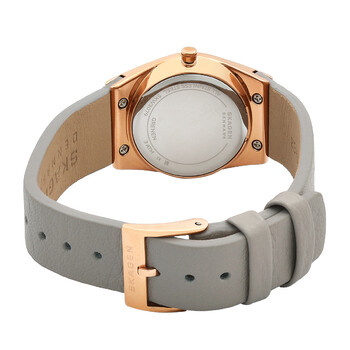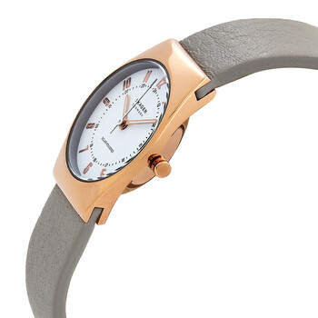 Rose gold-tone stainless steel case with a greystone leather strap. Fixed rose gold-tone stainless steel bezel. White dial with rose gold-tone hands and Arabic numeral hour markers. Minute markers around the inner ring. Dial Type: Analog. Luminescent hands and markers. Solar movement. Scratch resistant K1 crystal. Pull / push crown. Solid case back. Round case shape, case size: 26 mm. Band width: 16 mm. Tang clasp. Water resistant at 30 meters / 100 feet. Functions: hour, minute, second. Grenen Lille Solar Powered Series. Casual watch style. Skagen Grenen Lille Solar Powered White Dial Ladies Watch SKW3079.