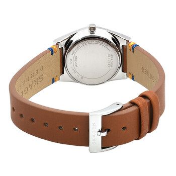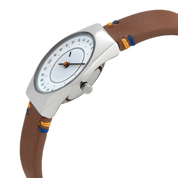 Silver-tone stainless steel case with a brown leather strap. Fixed silver-tone stainless steel bezel. White dial with blue and white hands. Dial Type: Analog. Solar movement. Scratch resistant mineral crystal. Pull / push crown. Solid case back. Round case shape, case size: 26 mm. Band width: 12 mm. Buckle clasp. Water resistant at 30 meters / 100 feet. Functions: hour, minute. Grenen Lille Series. Casual watch style. Skagen Grenen Lille Solar White Dial Ladies Watch SKW3086.