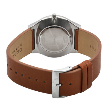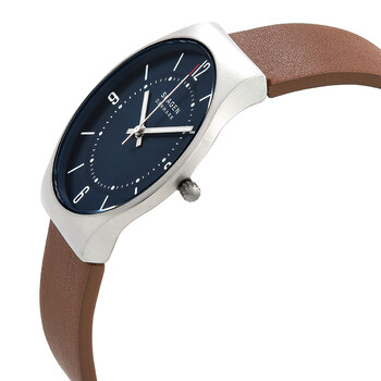 Silver-tone stainless steel case with a brown leather strap. Fixed silver-tone stainless steel bezel. Ocean blue dial with silver-tone hands and index-Arabic numeral hour markers. Arabic numeral marker appears at the 3, 6, 9 and 12 o'clock positions. Minute markers around the inner ring. Dial Type: Analog. Luminescent hands. Quartz movement. Scratch resistant mineral crystal. Pull / push crown. Solid case back. Round case shape, case size: 37 mm. Band width: 22 mm. Buckle clasp. Water resistant at 30 meters / 100 feet. Functions: hour, minute, second. Grenen Series. Casual watch style. Skagen Grenen Quartz Ocean Blue Dial Unisex Watch SKW6852.