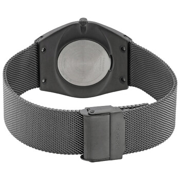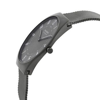 Charcoal stainless steel case with a charcoal stainless steel mesh bracelet. Fixed charcoal stainless steel bezel. Charcoal dial with charcoal hands and Arabic numeral hour markers. Minute markers around the inner ring. Dial Type: Analog. Luminescent hands and markers. Quartz movement. Scratch resistant sapphire crystal. Pull / push crown. Solid case back. Round case shape, case size: 37 mm. Band width: 22 mm. Safety mesh buckle clasp. Water resistant at 30 meters / 100 feet. Functions: hour, minute. Grenen Ultra Slim Series. Casual watch style. Skagen Grenen Ultra Slim Quartz Charcoal Dial Unisex Watch SKW6824.
