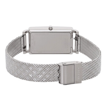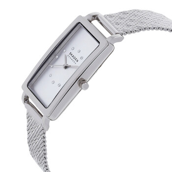 Silver-tone stainless steel case with a silver-tone stainless steel mesh bracelet. Fixed silver-tone stainless steel bezel. Silver-tone dial with silver-tone hands and crystal hour markers. Dial Type: Analog. Quartz movement. Scratch resistant mineral crystal. Pull / push crown. Solid case back. Rectangle case shape, case size: 43 mm. Band width: 14 mm. Fold over clasp with a safety release. Water resistant at 30 meters / 100 feet. Functions: hour, minute, second. Hagen Series. Casual watch style. Skagen Hagen Quartz Crystal Silver Dial Ladies Watch SKW3115.