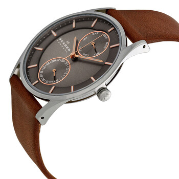 Stainless steel case with a brown leather strap. Fixed stainless steel bezel. Charcoal dial with luminous rose gold-tone hands and index hour markers. Minute markers around the outer rim. Dial Type: Analog. Two sub-dials displaying: day of the week and date. Quartz movement. Scratch resistant mineral crystal. Pull / push crown. Solid case back. Round case shape, case size: 40 mm, case thickness: 9 mm. Band width: 20 mm. Tang clasp. Water resistant at 50 meters / 165 feet. Functions: date, day, hour, minute, second. Additional Info: in general, suitable for short periods of recreational swimming, but not diving or snorkeling. Casual watch style. Skagen Holst Charcoal Dial Brown Leather Men's Watch SKW6086.