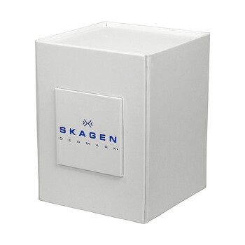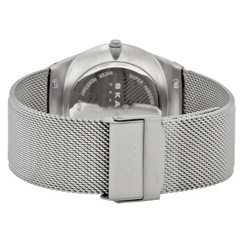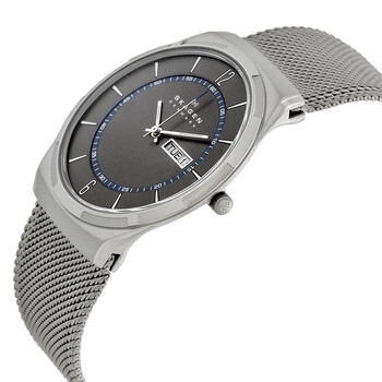Titanium case with a stainless steel mesh bracelet. Fixed titanium bezel. Grey dial with luminous silver-tone hands and index hour markers. Arabic numeral marks the 6 and 12 o'clock positions. Minute markers around an inner ring. Dial Type: Analog. Luminescent hands and markers. Day and date display at the 3 o'clock position. Quartz movement. Scratch resistant mineral crystal. Pull / push crown. Solid case back. Case diameter: 40 mm. Case thickness: 7.6 mm. Round case shape. Fold over slip through clasp. Water resistant at 50 meters / 165 feet. Functions: date, day, hour, minute, second. Casual watch style. Skagen Melbye Grey Dial Stainless Steel Mesh Bracelet Men's Watch SKW6078.