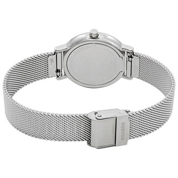 Stainless steel case with a stainless steel mesh bracelet. Fixed stainless steel bezel. White dial with silver-tone hands and index hour markers. Dial Type: Analog. Quartz movement. Scratch resistant mineral crystal. Pull / push crown. Solid case back. Round case shape. Case size: 30 mm. Case thickness: 6 mm. Band width: 14 mm. Fold over slip through clasp. Water resistant at 30 meters / 100 feet. Functions: hour, minute. Casual watch style. Watch label: Japan Movt. Skagen Signatur White Dial Ladies Watch SKW2692.