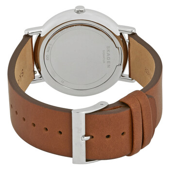 Stainless steel case with a brown leather strap. Fixed stainless steel bezel. Blue dial with luminous silver-tone hands and index hour markers. Arabic numeral minute markers (at 5 minute intervals). Minute markers around the outer rim. Dial Type: Analog. Luminescent hands and markers. Quartz movement. Scratch resistant mineral crystal. Pull / push crown. Solid case back. Round case shape. Case size: 40 mm. Case thickness: 8 mm. Band width: 20 mm. Tang clasp. Water resistant at 50 meters / 165 feet. Functions: hour, minute, second. Signature Series. Casual watch style. Skagen Signature Blue Dial Brown Leather Men's Watch SKW6355.