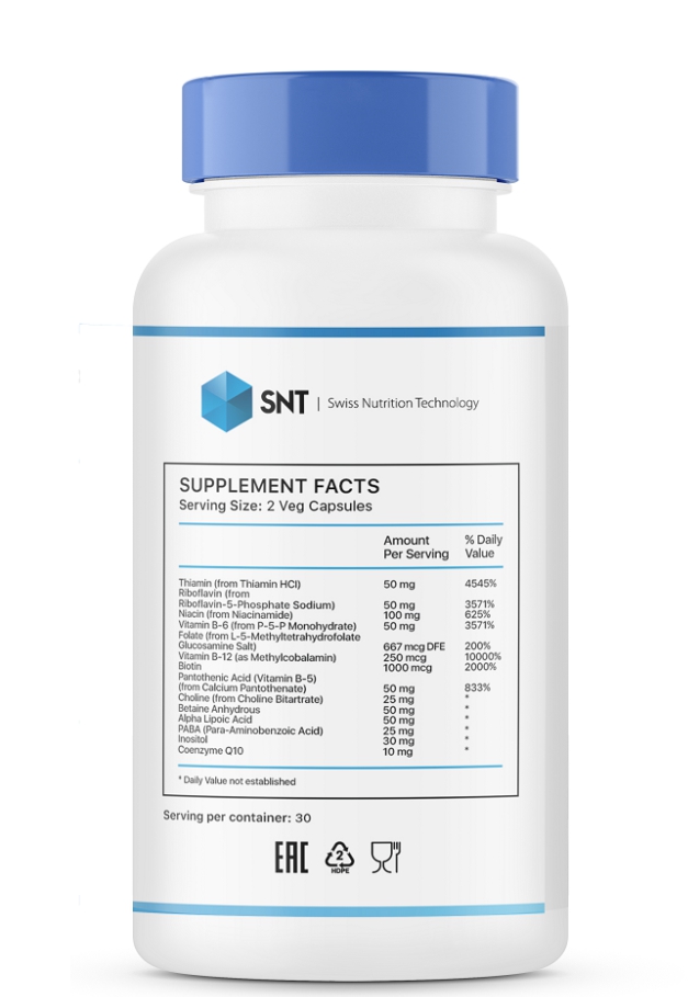 2 კაფსულაში: თიამინი (ვიტ. B-1) (თიამინის HCl-დან და კოკარბოქსილაზასგან) 50 მგ, რიბოფლავინი (რიბოფლავინის და ნატრიუმის რიბოფლავინ-5-ფოსფატის სახით) 50 მგ, ნიაცინი (ვიტამინი B-3) (ინოზიტოლ ჰექსანიკოტინატისა და NAD ტრიჰიდრატისგან) 100 მგ, ვიტამინი B-6 (პირიდოქსინის HCI-დან და P-5-P მონოჰიდრატისგან) 50 მგ, ფოლატი [კვატრეფოლიკის (6S) -5-MTHF-დან] 667 მკგ DFE, ვიტამინი B-12 (მეთილკობალამინის სახით) 250 მკგ, ბიოტინი 1000 მკგ, პანტოთენის მჟავა (ვიტამინი B-5) (კალციუმის პანტოთენატისა და პანთეტინისგან) 50 მგ, ქოლინი (ქოლინ ბიტარტრატიდან) 25 მგ, უწყლო ბეტაინი 50 მგ, ალფა-ლიპოის მჟავა 50 მგ, PABA (პარა-ამინობენზოის მჟავა) 25 მგ, ინოზიტოლი (ინოზიტოლ ჰექსანიკოტინატისგან, ინოზინ ჰექსაფოსფატისგან და ინოზიტისგან) 30 მგ, CoQ10 (კოენზიმი Q10) 10 მგ