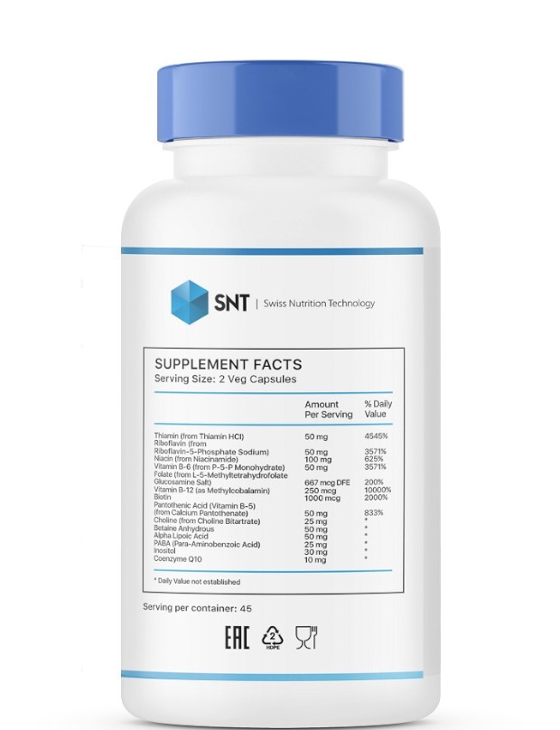 2 კაფსულაში: თიამინი (ვიტ. B-1) (თიამინის HCl-დან და კოკარბოქსილაზასგან) 50 მგ, რიბოფლავინი (რიბოფლავინის და ნატრიუმის რიბოფლავინ-5-ფოსფატის სახით) 50 მგ, ნიაცინი (ვიტამინი B-3) (ინოზიტოლ ჰექსანიკოტინატისა და NAD ტრიჰიდრატისგან) 100 მგ, ვიტამინი B-6 (პირიდოქსინის HCI-დან და P-5-P მონოჰიდრატისგან) 50 მგ, ფოლატი [კვატრეფოლიკის (6S) -5-MTHF-დან] 667 მკგ DFE, ვიტამინი B-12 (მეთილკობალამინის სახით) 250 მკგ, ბიოტინი 1000 მკგ, პანტოთენის მჟავა (ვიტამინი B-5) (კალციუმის პანტოთენატისა და პანთეტინისგან) 50 მგ, ქოლინი (ქოლინ ბიტარტრატიდან) 25 მგ, უწყლო ბეტაინი 50 მგ, ალფა-ლიპოის მჟავა 50 მგ, PABA (პარა-ამინობენზოის მჟავა) 25 მგ, ინოზიტოლი (ინოზიტოლ ჰექსანიკოტინატისგან, ინოზინ ჰექსაფოსფატისგან და ინოზიტისგან) 30 მგ, CoQ10 (კოენზიმი Q10) 10 მგ