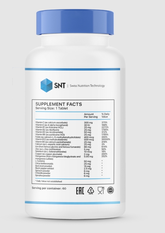 1 აბში: ვიტამინი C (კალციუმ ასკორბატის ფორმით) – 300 მგ, ვიტამინი E (დ-ალფა-ტოკოფეროლის ფორმით) – 30 IU, ვიტამინი B1 (თიამინ ჰიდროქლორიდის ფორმით) – 25 მგ, ვიტამინი B2 (რიბოფლავინის ფორმით) – 25 მგ, ვიტამინი B3 (ნიკოტინამიდის ფორმით) – 50 მგ, ვიტამინი B6 (პირიდოქსინ ჰიდროქლორიდის ფორმით) – 25 მგ, ფოლატი (კალციუმის L-5-მეთილტეტრაჰიდროფოლატის ფორმით) – 400 მკგ, ვიტამინი B12 (მეთილკობალამინის ფორმით) – 500 მკგ, ვიტამინი B5 (კალციუმ პანტოთენატის ფორმით) – 25 მგ, კალციუმი (L-ასპარტის მჟავის კალციუმის ფორმით) – 25 მგ, რკინა (რკინის გლიცინიდან და რკინის ფუმარატიდან) – 86 მგ, თუთია (L-თუთიის მეთიონინის ფორმით) – 5 მგ, სელენი (L-სელენომეთიონინის ფორმით) – 10 მკგ, სპილენძი (სპილენძის გლიცინატის ფორმით) – 2 მგ, მანგანუმი (მანგანუმის ბისგლიცინატისა და მანგანუმის სულფატისგან) – 5.05 მგ, L-ცისტეინი – 50 მგ, ციტრუსის ბიოფლავონოიდები – 25 მგ, ჭარხლის ფესვის ფხვნილი – 15 მგ, შავი წიწაკის ექსტრაქტი – 2.5 მგ, ისპანახის ფხვნილი – 6 მგ, ქლორელას ფხვნილი – 6 მგ, სპირულინას ფხვნილი – 6 მგ.