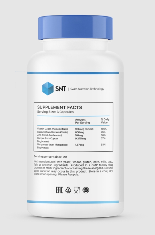 3 კაფსულაში: ვიტამინი D3 (ქოლეკალციფეროლის სახით) 375 IU, კალციუმი (კალციუმის ციტრატიდან) 600 მგ, თუთია (თუთიის მეთიონინიდან) 5.6 მგ, სპილენძი (სპილენძის ბისგლიცინატიდან) 375 მკგ, მანგანუმი (მანგანუმის ბისგლიცინატიდან) 1.87 მგ