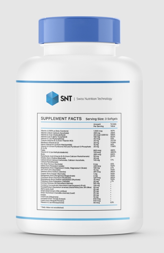 3 კაფსულაში: ვიტამინი A (ბეტა-კაროტინისა და რეტინილის პალმიტატის სახით) – 1,500 მკგ, ვიტამინი C (კალციუმის ასკორბატიდან) – 200 მგ, ვიტამინი D (ქოლეკალციფეროლისგან) – 25 მკგ (1000 საერთაშორისო ერთეული), ვიტამინი E (დ-ალფა-ტოკოფეროლის სახით) – 100 მგ, ვიტამინი K1 (ფიტონადიონის სახით) – 40 მკგ, თიამინი (ვიტამინი B1) (თიამინის ჰიდროქლორიდიდან) – 25 მგ, რიბოფლავინი (ვიტამინი B2) – 20 მგ, ნიაცინი (ვიტამინი B3) (ნიკოტინამიდისგან) – 15 მგ, ვიტამინი B6 (პირიდოქსინის ჰიდროქლორიდისა და პირიდოქსალ-5-ფოსფატისგან) – 25 მგ, ფოლიუმის მჟავა – 800 მკგ, ვიტამინი B12 (მეთილკობალამინის სახით) – 120 მკგ, ბიოტინი – 300 მკგ, პანტოთენის მჟავა (ვიტამინი B5) (კალციუმის პანტოთენატიდან) – 50 მგ, ქოლინი (ქოლინის ბიტარტრატიდან) – 20 მგ, კალციუმი (კალციუმის ასკორბატიდან, კალციუმის კარბონატიდან და კალციუმის პანტოთენატიდან) – 140 მგ, იოდი (პოტასიუმის იოდიდიდან) – 225 მკგ, მაგნიუმი (მაგნიუმის ოქსიდიდან და მაგნიუმის ციტრატიდან) – 100 მგ, თუთია (თუთიის გლიცინატიდან) – 15 მგ, სელენი (ნატრიუმის სელენიტიდან) – 201 მკგ, სპილენძი (სპილენძის გლიცინატიდან) – 1 მგ, მანგანუმი (მანგანუმის ბისგლიცინატიდან) – 2 მგ, ქრომი (ქრომის პიკოლინატიდან) – 120 მკგ, მოლიბდენი (ნატრიუმის მოლიბდატ დიჰიდრატიდან) – 75 მკგ, კალიუმი (კალიუმის ქლორიდიდან) – 25 მგ, საღამოს პრიმულას ზეთი (Oenithera biennis) – 501 მგ, მოცვის კონცენტრატი (Vaccinium macrocarpon) (ხილი) – 100 მგ, ვირთხისფეხას ექსტრაქტი (Equisetum arvense) (ზედა ნაწილი) (მინიმუმ 8% სილიციუმი) – 50 მგ, ალფა ლიპოიდური მჟავა – 25 მგ, ყურძნის კურკის ექსტრაქტი (Vitis vinifera) – 25 მგ, მწვანე ჩაის ექსტრაქტი – 25 მგ, ინოზიტოლი – 20 მგ, კოენზიმ Q10 (უბიქინონის სახით) – 10 მგ, ლიკოპინი (პომიდვრის ექსტრატიდან) – 510 მკგ, ლუტეინი (გოგრის ყვავილის ექსტრატიდან) – 510 მკგ.