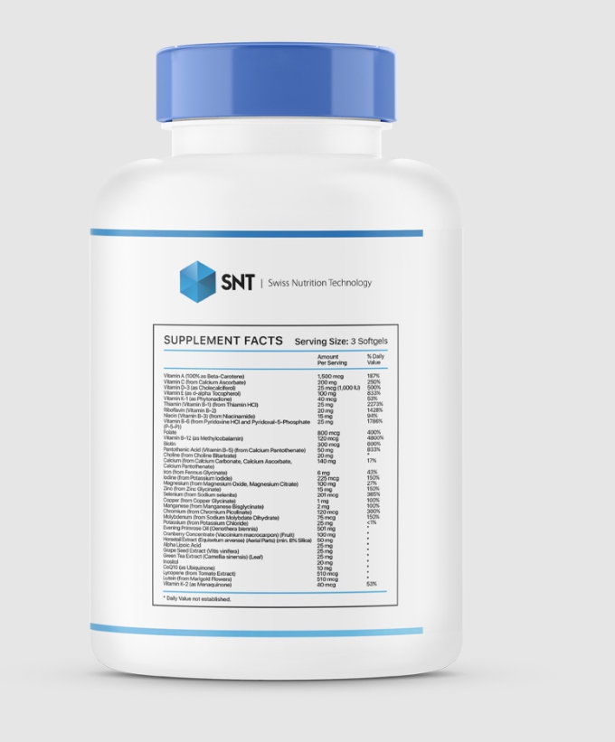 3 კაფსულაში: ვიტამინი A (ბეტა-კაროტინისა და რეტინილის პალმიტატის სახით) – 1,500 მკგ, ვიტამინი C (კალციუმის ასკორბატიდან) – 200 მგ, ვიტამინი D (ქოლეკალციფეროლისგან) – 25 მკგ (1000 საერთაშორისო ერთეული), ვიტამინი E (დ-ალფა-ტოკოფეროლის სახით) – 100 მგ, ვიტამინი K1 (ფიტონადიონის სახით) – 40 მკგ, თიამინი (ვიტამინი B1) (თიამინის ჰიდროქლორიდიდან) – 25 მგ, რიბოფლავინი (ვიტამინი B2) – 20 მგ, ნიაცინი (ვიტამინი B3) (ნიკოტინამიდისგან) – 15 მგ, ვიტამინი B6 (პირიდოქსინის ჰიდროქლორიდისა და პირიდოქსალ-5-ფოსფატისგან) – 25 მგ, ფოლიუმის მჟავა – 800 მკგ, ვიტამინი B12 (მეთილკობალამინის სახით) – 120 მკგ, ბიოტინი – 300 მკგ, პანტოთენის მჟავა (ვიტამინი B5) (კალციუმის პანტოთენატიდან) – 50 მგ, ქოლინი (ქოლინის ბიტარტრატიდან) – 20 მგ, კალციუმი (კალციუმის ასკორბატიდან, კალციუმის კარბონატიდან და კალციუმის პანტოთენატიდან) – 140 მგ, იოდი (პოტასიუმის იოდიდიდან) – 225 მკგ, მაგნიუმი (მაგნიუმის ოქსიდიდან და მაგნიუმის ციტრატიდან) – 100 მგ, თუთია (თუთიის გლიცინატიდან) – 15 მგ, სელენი (ნატრიუმის სელენიტიდან) – 201 მკგ, სპილენძი (სპილენძის გლიცინატიდან) – 1 მგ, მანგანუმი (მანგანუმის ბისგლიცინატიდან) – 2 მგ, ქრომი (ქრომის პიკოლინატიდან) – 120 მკგ, მოლიბდენი (ნატრიუმის მოლიბდატ დიჰიდრატიდან) – 75 მკგ, კალიუმი (კალიუმის ქლორიდიდან) – 25 მგ, საღამოს პრიმულას ზეთი (Oenithera biennis) – 501 მგ, მოცვის კონცენტრატი (Vaccinium macrocarpon) (ხილი) – 100 მგ, ვირთხისფეხას ექსტრაქტი (Equisetum arvense) (ზედა ნაწილი) (მინიმუმ 8% სილიციუმი) – 50 მგ, ალფა ლიპოიდური მჟავა – 25 მგ, ყურძნის კურკის ექსტრაქტი (Vitis vinifera) – 25 მგ, მწვანე ჩაის ექსტრაქტი – 25 მგ, ინოზიტოლი – 20 მგ, კოენზიმ Q10 (უბიქინონის სახით) – 10 მგ, ლიკოპინი (პომიდვრის ექსტრატიდან) – 510 მკგ, ლუტეინი (გოგრის ყვავილის ექსტრატიდან) – 510 მკგ.