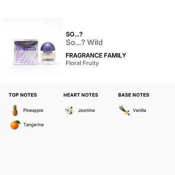 So...? Wild opens with bright and juicy top notes of pineapple and tangerine, delivering a vibrant and refreshing first impression. As the scent settles, delicate heart notes of jasmine add a soft and feminine touch, creating a beautiful balance between sweet and floral. The warm base of vanilla wraps everything together, leaving a smooth and lasting impression that lingers throughout the day.