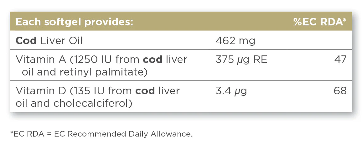 Solgar – Cod Liver Oil + Vitamins A & D არის ბუნებრივი წყარო მნიშვნელოვანი ცხიმოვანი მჟავებისა და ვიტამინების, რომლებიც აუცილებელია ძვლების, კანის, მხედველობისა და იმუნური სისტემის ჯანმრთელობისთვის. პროდუქტი შეიცავს მაღალი ხარისხის თევზის ღვიძლის ზეთს, გამდიდრებული ვიტამინებით A და D, რაც კიდევ უფრო აძლიერებს მის ფუნქციურ შესაძლებლობებს.