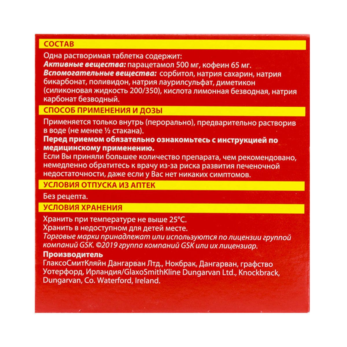 ერთ ტაბლეტი შეიცავს 500 მგ პარაცეტამოლს და 65 მგ კოფეინს.