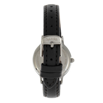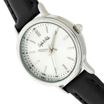 Silver-tone alloy case with a black genuine leather strap. Fixed silver-tone alloy bezel. Silver-tone dial with silver-tone hands and index hour markers. Minute markers around the outer rim. Dial Type: Analog. Quartz movement. Scratch resistant mineral crystal. Pull / push crown. Solid case back. Round case shape, case size: 26 mm, case thickness: 8 mm. Band width: 12 mm. Buckle clasp. Water resistant at 30 meters / 100 feet. Functions: hour, minute, second. Casual watch style. Watch label: Japan Movt. Item Variations: SAFSF4801. Sophie And Freda Berlin Quartz Silver Dial Ladies Watch SF4801.