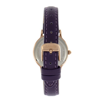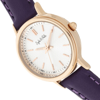 Rose gold-tone alloy case with a purple genuine leather strap. Fixed rose gold-tone alloy bezel. Silver-tone dial with rose gold-tone hands and index hour markers. Minute markers around the outer rim. Dial Type: Analog. Quartz movement. Scratch resistant mineral crystal. Pull / push crown. Solid case back. Round case shape, case size: 26 mm, case thickness: 8 mm. Band width: 12 mm. Buckle clasp. Water resistant at 30 meters / 100 feet. Functions: hour, minute, second. Casual watch style. Watch label: Japan Movt. Item Variations: SAFSF4805. Sophie And Freda Berlin Quartz Silver Dial Ladies Watch SF4805.