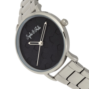 Silver-tone alloy case with a silver-tone stainless steel bracelet. Fixed silver-tone alloy bezel. Black dial with silver-tone hands. Dial Type: Analog. Quartz movement. Scratch resistant mineral crystal. Pull / push crown. Solid case back. Round case shape, case size: 34 mm, case thickness: 9 mm. Band width: 16 mm. Fold over push button deployment clasp. Water resistant at 30 meters / 100 feet. Functions: hour, minute, second. Casual watch style. Watch label: Japan Movt. Item Variations: SAFSF4701. Sophie And Freda Breckenridge Quartz Black Dial Ladies Watch SF4701.