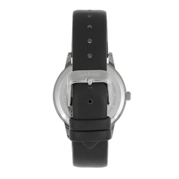 Silver-tone alloy case with a black genuine leather strap. Fixed silver-tone alloy bezel. Black dial with silver-tone hands and index hour markers. Minute markers around the outer rim. Dial Type: Analog. Quartz movement. Scratch resistant mineral crystal. Pull / push crown. Solid case back. Round case shape, case size: 36 mm, case thickness: 9 mm. Band width: 18 mm. Buckle clasp. Water resistant at 30 meters / 100 feet. Functions: hour, minute, second. Casual watch style. Watch label: Japan Movt. Item Variations: SAFSF5101. Sophie And Freda San Diego Quartz Black Dial Ladies Watch SF5101.
