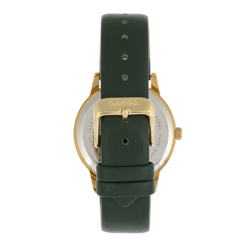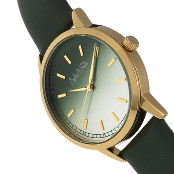Gold-tone alloy case with a green genuine leather strap. Fixed gold-tone alloy bezel. Green dial with gold-tone hands and index hour markers. Minute markers around the outer rim. Dial Type: Analog. Quartz movement. Scratch resistant mineral crystal. Pull / push crown. Solid case back. Round case shape, case size: 36 mm, case thickness: 9 mm. Band width: 18 mm. Buckle clasp. Water resistant at 30 meters / 100 feet. Functions: hour, minute, second. Casual watch style. Watch label: Japan Movt. Item Variations: SAFSF5103. Sophie And Freda San Diego Quartz Green Dial Ladies Watch SF5103.