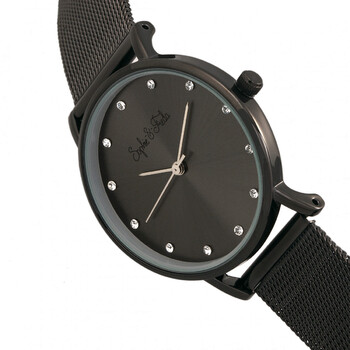 Black alloy case with a black alloy bracelet. Fixed black alloy bezel. Black dial with silver-tone hands and crystal hour markers. Dial Type: Analog. Quartz movement. Scratch resistant mineral crystal. Pull / push crown. Solid case back. Round case shape, case size: 32 mm, case thickness: 8 mm. Band width: 16 mm. Box with tongue and safety clasp. Water resistant at 30 meters / 100 feet. Functions: hour, minute, second. Dress watch style. Watch label: Japan Movt. Item Variations: SAFSF4203. Sophie And Freda Savannah Crystal Black Dial Ladies Watch SF4203.