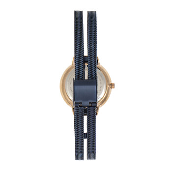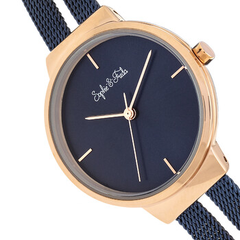 Rose gold-tone alloy case with a blue stainless steel mesh bracelet. Fixed rose gold-tone alloy bezel. Blue dial with rose gold-tone hands. Index markers at the 3, 6, 9 and 12 o'clock positions. Dial Type: Analog. Quartz movement. Scratch resistant mineral crystal. Pull / push crown. Solid case back. Round case shape. Case size: 30 mm. Case thickness: 7 mm. Band width: 12 mm. Box clasp with tongue and safety. Water resistant at 30 meters / 100 feet. Functions: hour, minute, second. Casual watch style. Watch label: Japan Movt. Item Variations: SAFSF5306. Sophie And Freda Sedona Quartz Blue Dial Ladies Watch SF5306.