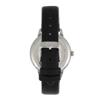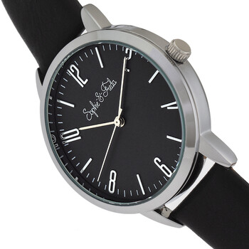 Silver-tone alloy case with a black genuine leather strap. Fixed silver-tone alloy bezel. Black dial with silver-tone hands and Arabic numeral and index hour markers. Minute markers around the outer rim. Dial Type: Analog. Quartz movement. Scratch resistant mineral crystal. Pull / push crown. Solid case back. Round case shape, case size: 36 mm, case thickness: 9 mm. Band width: 16 mm. Buckle clasp. Water resistant at 30 meters / 100 feet. Functions: hour, minute, second. Casual watch style. Watch label: Japan Movt. Item Variations: SAFSF4901. Sophie And Freda Vancouver Quartz Black Dial Ladies Watch SF4901.
