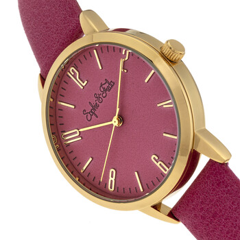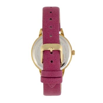 Gold-tone alloy case with a pink genuine leather strap. Fixed gold-tone alloy bezel. Pink dial with gold-tone hands and Arabic numeral and index hour markers. Minute markers around the outer rim. Dial Type: Analog. Quartz movement. Scratch resistant mineral crystal. Pull / push crown. Solid case back. Round case shape, case size: 36 mm, case thickness: 9 mm. Band width: 16 mm. Buckle clasp. Water resistant at 30 meters / 100 feet. Functions: hour, minute, second. Casual watch style. Watch label: Japan Movt. Item Variations: SAFSF4903. Sophie And Freda Vancouver Quartz Pink Dial Ladies Watch SF4903.