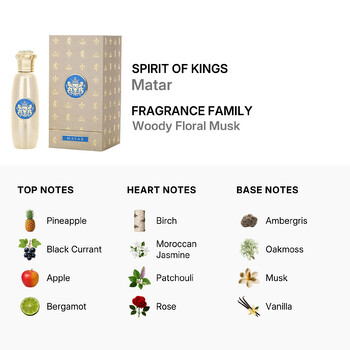Matar belongs to the Woody Floral Musk fragrance family, blending a harmonious mix of top, heart, and base notes. The top notes of Pineapple, Black Currant, Apple, and Bergamot create a fresh and fruity opening that is both invigorating and inviting. As the scent develops, the heart notes of Birch, Moroccan Jasmine, Patchouli, and Rose emerge, adding depth and complexity with their rich and floral undertones.