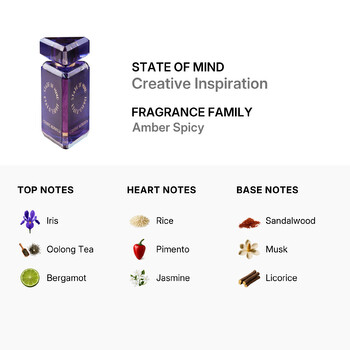 Part of the Amber Spicy fragrance family, Creative Inspiration opens with an intriguing mix of iris, oolong tea, and bergamot, offering a fresh yet refined introduction. The heart reveals an unexpected harmony of rice, pimento, and jasmine, adding depth and a touch of exotic warmth. Finally, the base unfolds with the rich and sensual notes of sandalwood, musk, and licorice, leaving a lasting impression that is both comforting and bold.