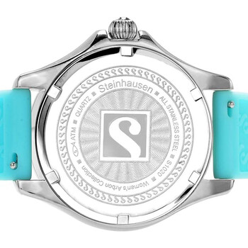Steinhausen; since 1923 we've strived to make a impact in the watch industry with exciting designs and quality timepieces. Color By Steinhausen; vibrant colored stones, stainless steel rounded watch, easlity interchangable colored bands, 3 hands, embossed crown. Steinhausen custom embossed silicone easily interchangable bands. 38 mm stainless steel case with mineral dial window. Water resistant to 165 ft, withstands splashes or brief immersions in water but not suitable for swimming or showering. Silver-tone stainless steel case with a blue silicone strap. Fixed blue stainless steel bezel. Multi-color dial with silver-tone hands and index hour markers. Dial Type: Analog. Luminescent hands. Quartz movement. Pull / push crown. Solid case back. Round case shape, case size: 38 mm, case thickness: 2 mm. Band width: 2 mm. Buckle clasp. Water resistant at 50 meters / 165 feet. Functions: hour, minute, second. Arbon Series. Casual watch style. Watch label: Japanese. Steinhausen Arbon Multi-Color Dial Ladies Watch S01020.