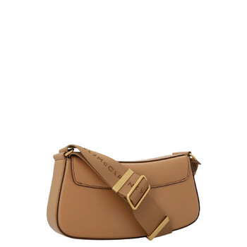 Stella McCartney Ladies Shoulder Bag. SKU: 7B0025WP01092742. Color: Camel. Size: 28 x 14.5 x 5 cm. Stella McCartney Camel S-Wave Shoulder Bag. The S-Wave shoulder bag, made in Italy, features an elongated baguette silhouette with a recycled brass 'S-Wave' gold monogram plaque on the front, a front flap with magnetic snap fastening, an adjustable Stella McCartney logo shoulder strap, one internal slip pocket, and is fully lined in S-Wave monogram print recycled materials. Made in Italy.