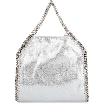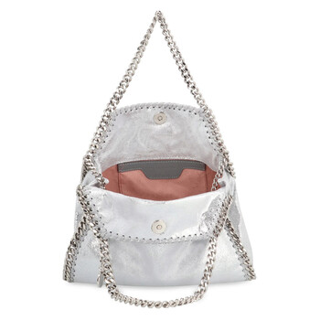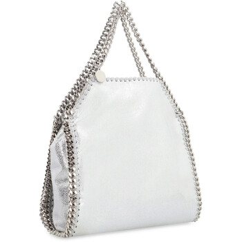 Stella McCartney Ladies Tote. SKU: 371223WP0301-8101. Color: Grey. Size: W:26.5cm x H:23.5cm x D:10cm. Stella McCartney Mini Falabella Tote Bag. This faux suede tote bag features a lame effect, magnetic fastening, two chain-link top handles, and a chain-link shoulder strap, with a logo pendant, whipstitch chain trim, a main compartment, a debossed internal logo, an internal patch pocket, and logo-jacquard lining. 100% Polyester, 100% Recycled Nylon. Made in Italy.