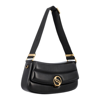 Stella McCartney Ladies Shoulder Bag. SKU: 7B0025 WP0110-1000. Material: Polyester. Color: Black. Size: W:26cm x H:14cm x D:5cm. Stella McCartney S-Wave Logo Plaque Padded Shoulder Bag. This shoulder bag features a padded design, a gold-tone logo plaque, a front flap closure with magnetic fastening, an adjustable shoulder strap, a main compartment, and an internal slip pocket. 56% Polyurethane, 44% Polyester, Lining: 100% Recycled Polyester. Made in Italy.