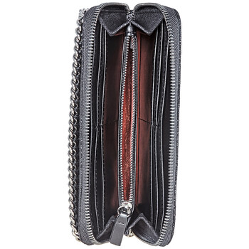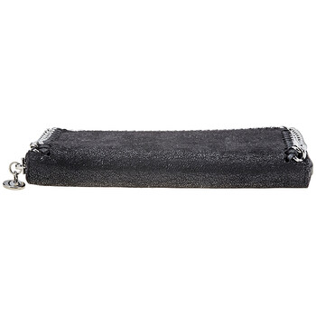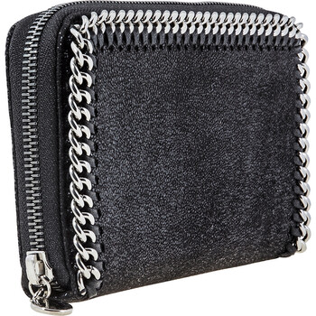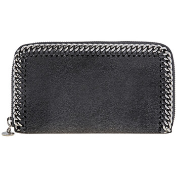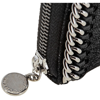 Stella Mccartney Zip Around Falabella wallet. SKU:434750-W9132-1000 Color: Black. Crafted from shiny soft shaggy deer faux leather, this zip-around wallet features ruthenium diamond-shaped chain trim and metallic logo charm, eight card slots, one zip pocket and four bill compartments.