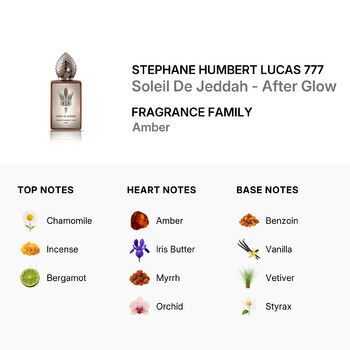 At its core, Soleil De Jeddah - After Glow boasts a radiant assembly of amber, iris butter, myrrh, and orchid. The heart notes embody a deep, warm, and subtly sweet composition that enhances the fragrance’s overall character. Their blend gives the fragrance an opulent depth that's hard to resist.