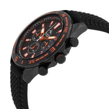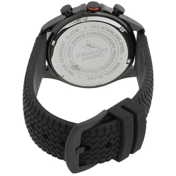 Black stainless steel case with a black silicone strap. Fixed black stainless steel bezel. Black dial with orange hands and index hour markers. Minute markers around the outer rim. Dial Type: Analog. Luminescent hands and markers. Chronograph - three sub-dials displaying: 60 second, 60 minute and 24 hour. Quartz movement. Scratch resistant mineral crystal. Solid case back. Round case shape, case size: 45 mm. Buckle clasp. Water resistant at 100 meters / 330 feet. Functions: chronograph, hour, minute, second. Sport Marine Chronograph Silicon Series. Sport watch style. Strumento Marino SPORT MARINE CHRONOGRAPH SILICON Quartz Black Dial Men's Watch SM123S/BK/NR/AR.
