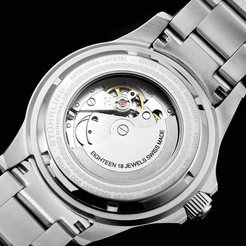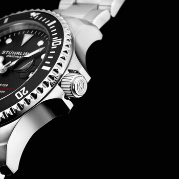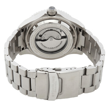 Stainless steel case with a stainless steel bracelet. Uni-directional rotating (120 click) stainless steel bezel with an inlaid black-plated (count-up elapsed time) top ring. Black dial with luminous silver-tone Mercedes-logo and Breguet-style hands and dot hour markers. Minute markers around the outer rim. Dial Type: Analog. Luminescent hands and markers. Date display at the 3 o'clock position. Claro calibre CL888 automatic movement, containing 18 Jewels, bitting at 21600 vph, and has a power reserve of approximately 38 hours. Scratch resistant Krysterna crystal. Screw down crown. Solid case back. Round case shape. Case size: 42.2 mm. Case thickness: 14.4 mm. Band width: 20 mm. Band length: 7.5 inches. Fold over clasp with a safety release. Water resistant at 200 meters / 660 feet. Functions: date, hour, minute, second. Aquadiver Series. Dive watch style. Watch label: Swiss Movt. Stuhrling Original Aquadiver Automatic Black Dial Men's Watch M13534.