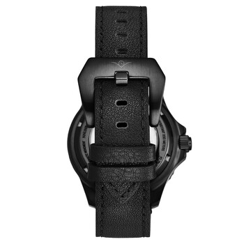 Black stainless steel case with a black leather strap. Uni-directional rotating black stainless steel bezel. Black dial with silver-tone hands and index hour markers. Minute markers around the outer rim. Dial Type: Analog. Luminescent hands and markers. Date display at the 3 o'clock position. Automatic movement. Scratch resistant mineral crystal. Screw down crown. Transparent case back. Round case shape, case size: 42 mm, case thickness: 16 mm. Band width: 20 mm, band length: 8.3 inches. Buckle clasp. Water resistant at 200 meters / 660 feet. Functions: date, hour, minute, second. Aquadiver Series. Dive watch style. Stuhrling Original Aquadiver Automatic Black Dial Men's Watch M17101.
