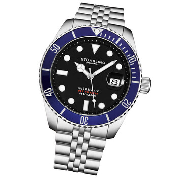 Men's Automatic Dive Watch with Swiss Movement, Stainless Steel Case, Black Dial, blue bezel, Stainless Jubilee bracelet Silver-tone alloy case with a silver-tone stainless steel bracelet. Blue alloy bezel. Black dial with silver-tone hands and index hour markers. Minute markers around the outer rim. Dial Type: Analog. Luminescent hands and markers. Date display at the 3 o'clock position. Automatic movement. Transparent see through case back. Round case shape, case size: 50 mm. Band width: 22 mm. Fold over clasp with a safety release. Water resistant at 200 meters / 660 feet. Functions: date, hour, minute, second. Additional Info: luminous hands, luminous markers, day of month. Aquadiver Series. Dress watch style. Stuhrling Original Aquadiver Automatic Black Dial Men's Watch M18017.