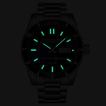Stainless steel case with a stainless steel bracelet. Uni-directional rotating stainless steel bezel with an inlaid black ring. Blue dial with luminous silver-tone hands and index hour markers. Minute markers around the outer rim. Dial Type: Analog. Luminescent hands and markers. Day of the week and date display at the 3 o'clock position. Automatic movement. Scratch resistant mineral crystal. Screw down crown. Transparent case back. Round case shape. Case size: 44 mm. Case thickness: 16 mm. Band width: 22 mm. Band length: 7.5 inches. Fold over clasp with a safety release. Water resistant at 200 meters / 660 feet. Functions: date, day, hour, minute, second. Aquadiver Series. Dive watch style. Stuhrling Original Aquadiver Automatic Blue Dial Men's Watch M16758.