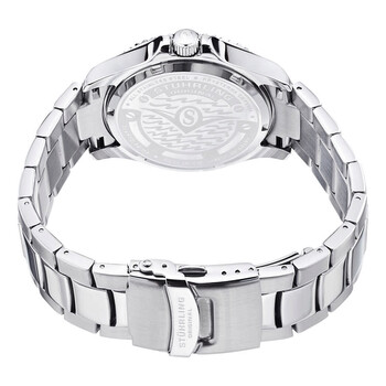 . Stainless steel case with a 1 stainless steel bracelet. Uni-directional rotating stainless steel bezel with an inlaid black ring. Black dial with luminous silver-tone hands and index hour markers. Minute markers around the outer rim. Dial Type: Analog. Luminescent hands and markers. Date display between the 4 and 5 o'clock positions. Quartz movement. Scratch resistant mineral crystal. Screw down crown. Solid case back. Round case shape. Case size: 42 mm. Case thickness: 11 mm. Band width: 22 mm. Fold over clasp with a safety release. Water resistant at 200 meters / 660 feet. Functions: date, hour, minute, second. Aquadiver Series. Dive watch style. Stuhrling Original Aquadiver Black Dial Men's Watch M15266.
