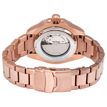 Find confidence and comfort in the classic dive watch styling of the fully automatic Depthmaster. Rose gold-tone alloy case with a rose gold-tone stainless steel bracelet. Uni-directional rotating rose gold-tone alloy bezel with an inlaid grey alloy ring. Grey dial with luminous rose gold-tone hands and dot hour markers. Minute markers around the outer rim. Dial Type: Analog. Luminescent hands and markers. Date display at the 3 o'clock position. Automatic movement. Scratch resistant mineral crystal. Screw down crown. Transparent case back. Round case shape. Case size: 42 mm. Case thickness: 11 mm. Deployment clasp with a push button release. Water resistant at 100 meters / 330 feet. Functions: date, hour, minute, second. Aquadiver Series. Dive watch style. Stuhrling Original Aquadiver Grey Dial Men's Watch M15724.