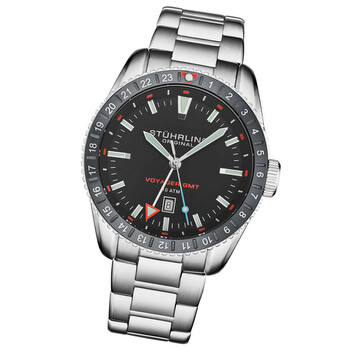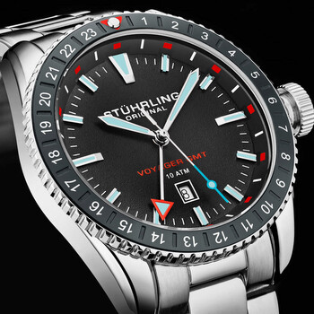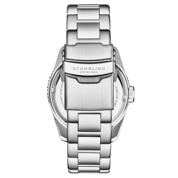 Silver-tone alloy case with a silver-tone stainless steel bracelet. Uni-directional rotating blue stainless steel bezel. Black dial with silver-tone hands and index hour markers. Minute markers around the outer rim. Dial Type: Analog. Luminescent hands and markers. Date display at the 6 o'clock position. Quartz movement. Scratch resistant mineral crystal. Screw down crown. Solid case back. Round case shape, case size: 42 mm, case thickness: 12 mm. Band length: 7.6 inches. Deployment with push button release clasp. Water resistant at 100 meters / 330 feet. Functions: date, hour, minute, second. Aquadiver Series. Dive watch style. Stuhrling Original Aquadiver Quartz Black Dial Men's Watch M17217.