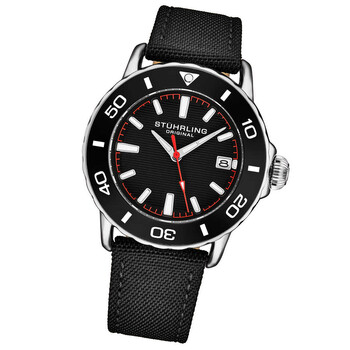 Mens Diver Alloy Silver case Black Nylon strap. Black Dial, Black Rotating Bezel Silver-tone alloy case with a black nylon strap. Black bezel. Blue dial with silver-tone hands and index hour markers. Minute markers around the outer rim. Dial Type: Analog. Luminescent hands and markers. Date display at the 3 o'clock position. Quartz movement. Round case shape, case size: 46 mm. Band width: 20 mm. Buckle clasp. Functions: date, hour, minute, second. Additional Info: luminous hands, luminous markers, day of month. Aquadiver Series. Dress watch style. Stuhrling Original Aquadiver Quartz Black Dial Men's Watch M17996.