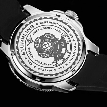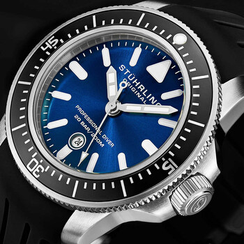Stainless steel case with a black rubber strap. Uni-directional rotating coin edge stainless steel bezel with a black ring. Blue dial with luminous silver-tone hands and index hour markers. Minute markers around the outer rim. Dial Type: Analog. Luminescent hands and markers. Date display at the 6 o'clock position. Miyota caliber 2115 quartz movement. Scratch resistant Krysterna crystal. Screw down crown. Solid case back. Round case shape. Case size: 42.5 mm. Case thickness: 13.5 mm. Band width: 20 mm. Band length: 8.5 inches. Tang clasp. Water resistant at 200 meters / 660 feet. Functions: date, hour, minute, second. Aquadiver Series. Dive watch style. Watch label: Japan Movt. Stuhrling Original Aquadiver Quartz Blue Dial Men's Watch M13623.